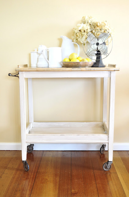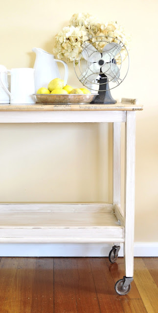 I ADORE this little cart. Henrietta is gorgeous and I love how you styled her up with the lovely fan and white accessories and lemons. I could see this being sold at Restoration Hardware for a pretty penny!